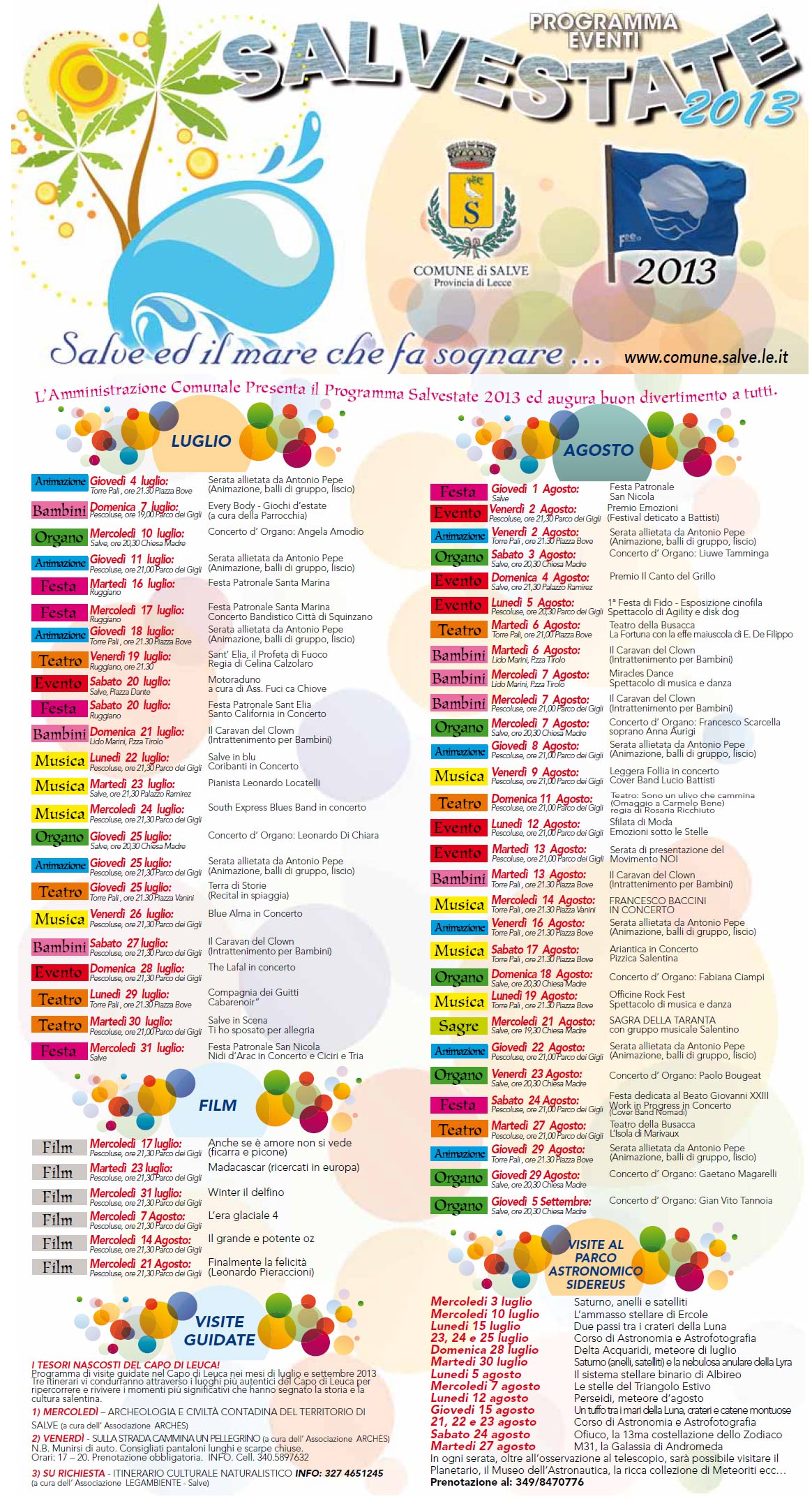 Recital in spiaggia, cinema all’aperto, visite al Parco Astronomico Sidereus, concerti, sfilate di moda, visite guidate nella natura e nell’archeologia, animazione, balli di gruppo, spettacoli di musica e danza, concerti d’organo: questo e molto altro è Salvestate 2013, la manifestazione organizzata per il XIV anno consecutivo a Salve e dintorni, in Salento, realizzata con la collaborazione di enti e operatori turistici.